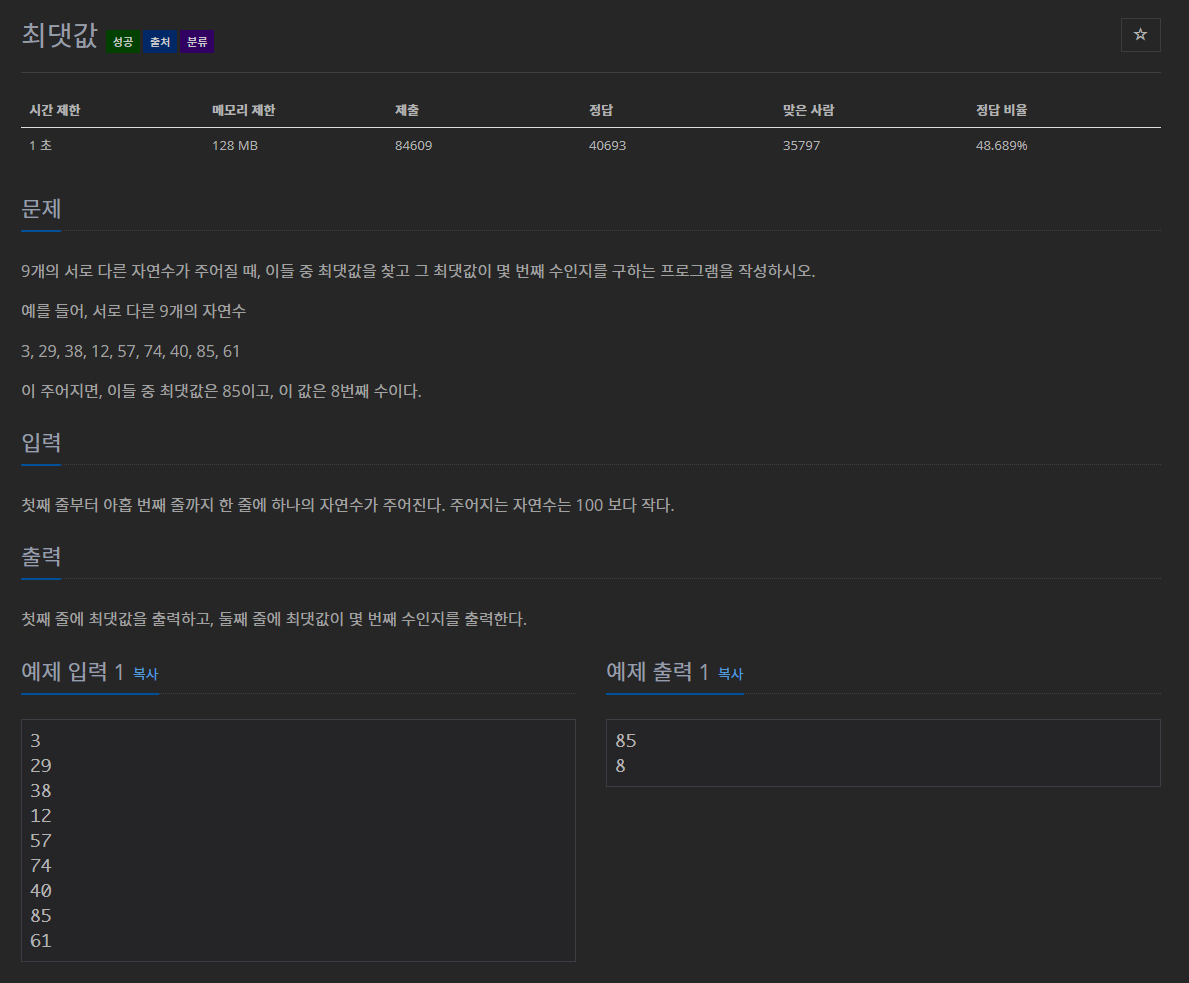 9개의 서로 다른 자연수가 주어질 때, 이들 중 최댓값을 찾고 그 최댓값이 몇 번째 수인지를 구하는 프로그램을 작성하시오. 예를 들어, 서로 다른 9개의 자연수 3, 29, 38, 12, 57, 74, 40, 85, 61 이 주어